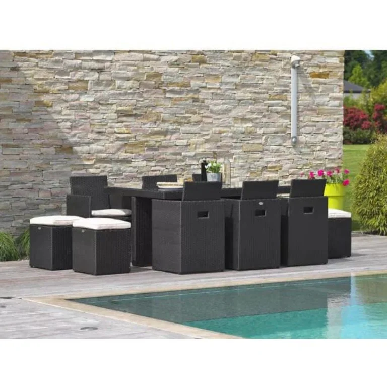 Sein Komfort und sein Design:  Seine 6 großen Sessel mit seinen Sitzkissen (4 cm dick für eine Dichte von 25 kg/m3) und seine 4 ecrufarbenen Hocker bilden einen perfekten Kontrast zum schlichten Schwarz Ihrer Gartengarnitur.